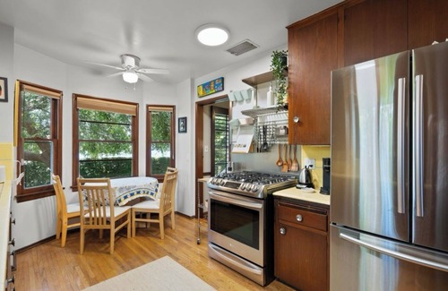 Welcome to our mid-century gem in one of Burbank’s most desirable neighborhoods. Styled with vintage furnishings and modern comforts, this home offers a light-filled living room with hardwood floors, stone fireplace, and French doors to a covered patio. The dining room, sunny breakfast nook, and fully stocked kitchen with gas stove are perfect for gathering. The primary bedroom features a queen bed and wood shutters for sleeping in. A spa-like bath with soaking tub. A second bedroom doubles as an office with a queen Murphy bed, sit-stand desk, ensuite bath, and patio access. Enjoy the shaded backyard with lounge seating and grill, or stroll the quiet, tree-lined streets. Amenities include washer/dryer, high-speed WiFi, linens, keyless entry, smart thermostat, Sonos sound sysyem, and gated parking. Minutes from studios, dining, and hiking.