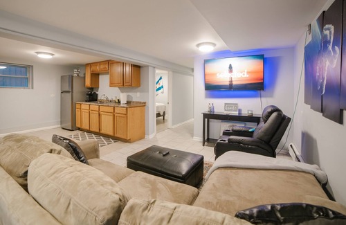 Steps from Midway Airport, our unit offers two bedrooms, a bathroom, a full kitchen with all your necessities and appliances, a dining space with a large stylish glass table and four chairs, and a living space with a couch and 55 inch TV with Roku.
