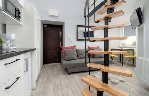 Located on the ground floor, the cozy studio impresses with its bright interior, which has been carefully decorated to provide comfort and a pleasant atmosphere. Elegant additions give it a modern and stylish feel, while the thoughtful layout makes the space functional and comfortable. The living area features a sofa bed that offers sleeping space for two. An additional bedroom option is a cozy single bed located on the mezzanine. The kitchenette has been fully equipped. There is an induction cooktop, a microwave oven and a pour-over coffee maker, making it possible to prepare both quick meals and more complicated dishes. Next to the annex there is a dining area, where you can sit down to a meal together in comfort. The bathroom, finished with attention to detail, offers a shower and a welcome toiletries kit. Fresh towels are also at guests' disposal. A washing machine will certainly come in handy during a longer stay. The studio offers a high-speed WiFi connection for hassle-free Internet access, as well as a flat-screen TV with SmartTV functionality, so guests can enjoy their favorite shows or movies at any time. The place is also friendly to those traveling with their pets.