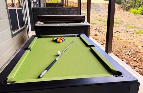 2 covered decks to enjoy sunset and mountain views | private hot tub | rocking chairs | billiards table | fire pit (wood, not included) | Ring security cameras at the front porch