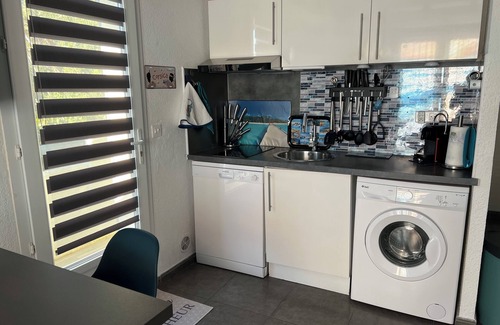 Rent by the week in Santa Giulia Bella vista very pretty mini villa F2 Fully furnished 42 m2 and equipped with a separate bedroom, a private bathroom with shower, a toilet, a fully equipped kitchen with induction hob, with several cooking utensils and housewares, 1 fridge, 1 washing machine and microwave grill, a dual function air conditioning cold and hot air, a flat screen TV as well as a large private terrace with barbecue and magnificent sea views.