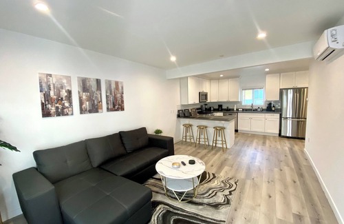 Modern & stylish new bungalow apartment, centrally located in Mid LA. This spacious unit is close to all the best attractions, entertainment, restaurants and shopping! Enjoy the convenience of everything you need within walking distance while in a serene, safe neighborhood. Beautiful professionally designed 1 bedroom, 1 bath home sleeps 4 & features a distinctive blend of contemporary style & luxurious comfort. Amenities include a full kitchen, queen bed, WiFi, Smart TV’s & free parking!
