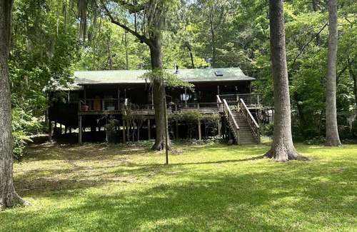Located on historic Potters Point, 369 MCR 3637 ,Jefferson TX 75657 . Miramar Camp on Caddo Lake Promises panoramic views. 2000 ft home, four bedrooms , two baths. Two master,two 4 bunk bedrooms. Sleeps 12 people. Cleaning fees vary by guest#. Become serene. CELL SERVICE ONLY. Dock for fishing boat and a raised upper deck provides a spectacular view. Full kitchen, giant lake side porch will BBQ PIT + FIRE PIT IN YARD. Noisy groups not tolerated and will be asked to leave without refund after 2nd neighbor complaint. Sorry!