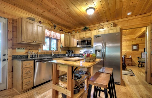 Inside, Misty Ridge exudes rustic charm with its adorable mountain decor and true wood-burning fireplace, ideal for cozy evenings spent snuggled up with a loved one. The fully furnished kitchen boasts stainless-steel appliances, inviting you to whip up delicious meals or midnight snacks to enjoy under a canopy of trees.