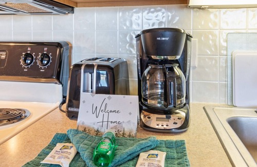 Modern kitchen with new oak cabinets. Refrigerator, dishwasher, and microwave. Full-size stove and oven. Coffee maker. Large kitchen island with seating for 4. Cozy living room with a fold-out couch. TV w/ DVD player. Coin-operated laundry facilities are located down the hall by the elevators.
