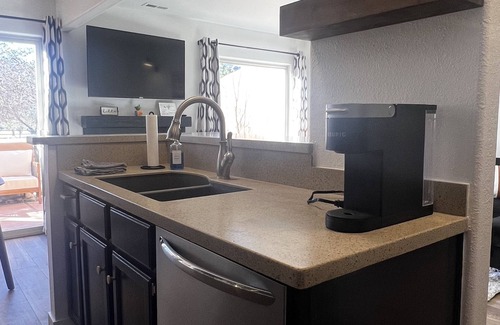 The condo has a fully stocked kitchen and a cozy living room with a gas fireplace, to unwind and share tales of your Moab adventures.