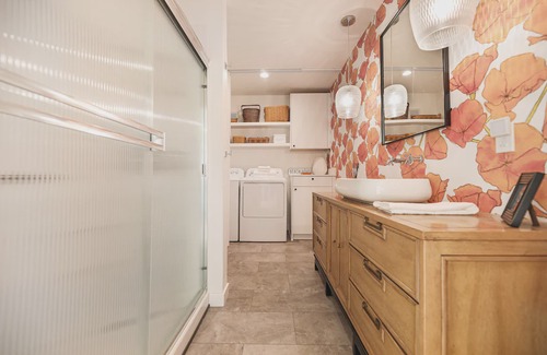 The kitchen is fully equipped with everything you need for a groovy night in: full stove, dishwasher and fridge. Turn on some music and check out our vintage barware. Outside, gather around the firepit under the hanging lights - being sure to check out the working drinking fountain salvaged from a school playground. A pond with a waterfall completes the outdoor setting.