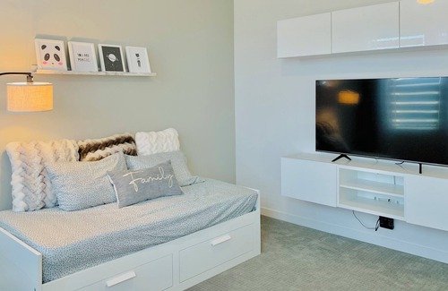 20-30 minutes to all San Diego attractions and San Diego International airport. This modern home located in urban community of Millenia Chula Vista. Walking distance to everything-community parks, basketball court, tennis court, dog park, pools, recreational facilities, shopping plaza, malls, food courts, public transit, miles of trails and many more. This turnkey house has 3 stories with views of parks and mountains. The kitchen is equipped with double ovens, double french door refrigerator, gas stove cooktop with a build in grill, microwave and dishwasher that can satisfy any chef. A rick cooker, air fryer, blender, toaster, a coffee maker are also provided for your convenience. Quartz counter top and island. 3 bedrooms with en-route bathrooms. Master bedroom also has california closet. Ceiling fans in each bedrooms and living room. Custom fans in each bedrooms and living room. Custom made roller blinds throughout providing flexible privacy control. In house washer and dryer. 20 ft high ceiling in living room. 75" QLED smart TV in living room and 55" QLED smart TV on 3rd floor family room. This house has whole house soft water system. The garage is equipped with level 2 tesla charger and small exercise area with a stationary bike and a ROKU TV. This house also features solar energy and smart devices like nest-yale lock, nest door bell and nest smart thermostat. This house can accomodate up to 6 guests. This house also has access to a private yard with outdoor seating and fire pit and solar lighting in the evening for some cozy get away. May trails to explore immediately outside this house!
