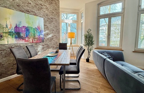 Modern apartment in Altbauvilla with 3 bedrooms and 2 bathrooms in the city is located in Center. Modern apartment in Altbauvilla with 3 bedrooms and 2 bathrooms in the city provides accommodation, featuring Bedding/Linens, Fireplace/Heating, Guest Services, among other amenities. This Apartment features Bedding/Linens, Fireplace/Heating, Guest Services, to make your stay a comfortable one.