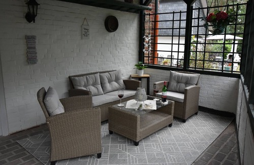 There is a covered lounge area with barbecue facilities in the entrance area. The large garden area of the vacation bungalow, including the outdoor fireplace, can be used by arrangement and subject to availability.