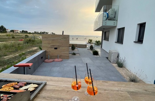 Look forward to a vacation in this newly built, modern apartment house with six units in a quiet location on the outskirts of the village and in the first row to the extensive sandy beach (without a road in between). In a few minutes by car you can reach all stores of the daily needs. The highly modern equipped apartment in urban style offers you a fully equipped open kitchen with dining bar, oven, dishwasher, microwave and washing machine, two bathrooms (each with shower), a spacious living room with expansive sofa area and two bedrooms. The living room and both bedrooms have air-conditioning and TV sets, the larger bedroom has panoramic windows and access to the large corner terrace where you can enjoy your breakfast at the dining table in the morning sun or sunbathe on the loungers all day. Enjoy the breathtaking view of the entire length of the bay from the bedroom and living room, listen to the gentle roll of the Mediterranean surf. Or take a refreshing dip in the heated pool, which is shared by all six units. In the evening, the house's own garden with fireplace is open to you for a cozy end to the vacation day.