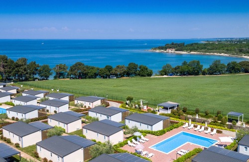 These beautiful chalet at Camping Kastanija are very comfortably and modernly furnished. You have the choice of a 6-person chalet (HR-52466-32) with two bedrooms and two bathrooms (one of which is en-suite) and an 8-person chalet (HR-52466-33) with three bedrooms and one bathroom. Both types have a sofa bed, so the 6-person is suitable for 4 adults and 2 children and the 8-person is suitable for 6 adults and 2 children. The beautiful covered terrace is equipped with garden furniture and therefore well-suited for sitting in the shade. The holiday park does not have just one big swimming pool, but rather several small swimming pools, so on average there is a swimming pool for every 8 chalets. The chalets are set directly around one of these swimming pools.