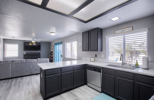 Located in a safe residential neighborhood, this private, recently renovated property is at the same time cozy and chic yet upscale. With almost all brand new items, from top-of-the-line linens, to comfy yet designer furnishings, brand new memory foam beds, a 65" smart tv in the living area, smart tv's in all rooms upstairs, complete home water softener, a fully stocked chefs kitchen w/ coffee bar, the coffee bar has free k-cups, to go cups for people on the go and free snacks. Brand new appliances, waffle maker and a farm house sink.