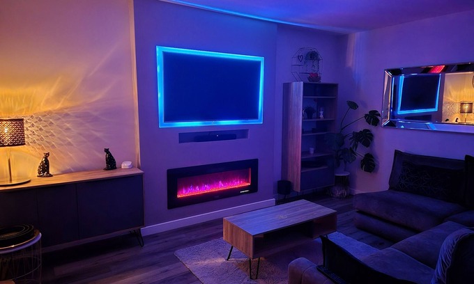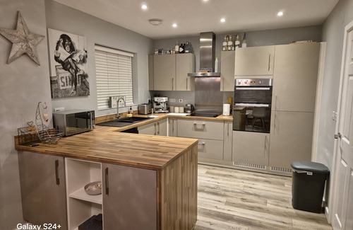 With fibre broadband, Philips smart TV with hue lighting, electric fire, bean to cup coffee, garden with artifical grass, separate washing machine, dryer and dishwasher.