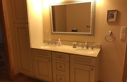 The home features a master bedroom with a king sized bed and a large loft with full and twin beds. A/C, TV, cable, internet and WiFi included. Outside deck features small table for quiet lunch for 2 or 4, and a large picnic table that seats 10, perfect for outdoor grilling.