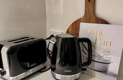 | Kitchen with oven, stovetop, microwave, dishwasher, pantry, kettle and toaster, coffee pod machine