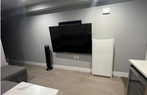 Step into our modern separate private suite. This exquisite abode features crafted engineered hardwood floors, a chef's kitchenette, a magnificent 75" smart TV with state-of-the-art SONOS surround system Playbar & rear speakers for a complete indulgence in a night of watching your favorite Netflix series or movies.