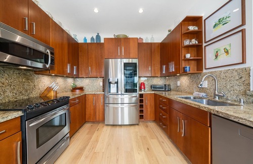The chef’s kitchen is fully stocked with premium cookware, oil, vinegar, spices, and includes a Nespresso coffee maker and complimentary starter coffee and tea. The villa also comes with cleaning supplies, paper goods, and laundry detergent for your convenience.