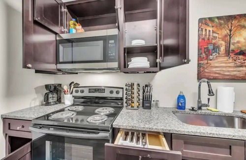 Experience urban living in our Modern Industrial Loft Near the Airport with High-Speed WiFi apartment. This sleek, open-concept space features a queen bedroom, a full kitchen, a dining area with four stools, and a cozy living room. Enjoy the convenience of an in-unit washer and dryer. Centrally located, this loft is perfect for up to 2 guests. We hope you book our place!
