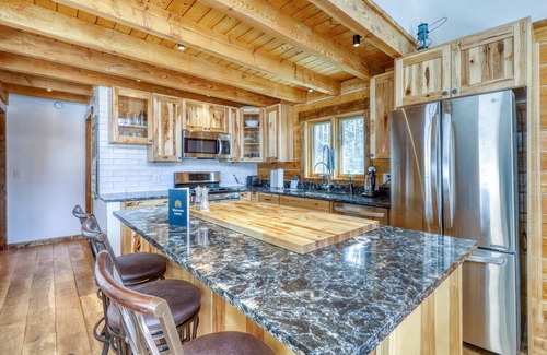 Relax in solitude with this multi-level and newly-updated mountain cabin. The large deck is an ideal spot to sip on your morning coffee and look for wildlife or spend an afternoon grilling as you soak in the endless mountain views. After a day of exploring the area, start a fire and enjoy the flatscreen TV or gather around the table for a card game as the fire crackles away. The kitchen is fully-equipped with stainless steel appliances and marvelous granite countertops for easy meal preparation–you can even find a sound dock there to stream your favorite tunes. You'll have everything you'll need for an unforgettable vacation in the Rockies.