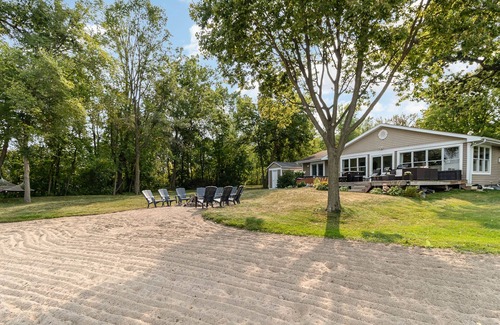 Relax and unwind in one of the most private Spring Lake settings! Just steps to the lake this lake home offers a modern layout with open concept floor plan- kitchen, living/dining room provide multiple windows with fabulous lake views from every room. Fully stocked kitchen, stainless steel appliances, gas stove, microwave, air fryer, juicer, coffee maker, & dishwasher. Dining table & kitchen island to accommodate plenty of seating. Living room has 58" TV, gas fireplace, buffet with wine fridge, extra large sectional, lots of games & puzzles to keep busy.