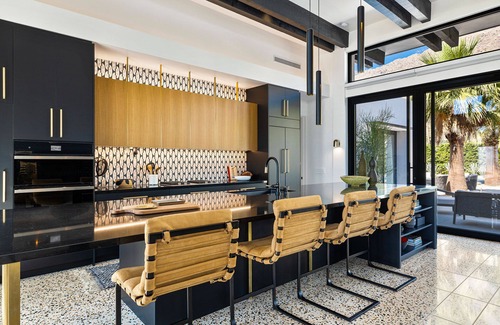 The fabulous interior has a spacious open concept floor plan, soaring ceilings, walls of glass and designer Palm Springs vibes. The living, dining and kitchen all look out to the poolside paradise. The living area has plenty of seating, TV, fireplace and pool table. The airy gourmet kitchen has high end appliances, and 4 seats at the island bar. The dining area has seating for 4.