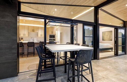 Inside, clean architectural lines, curated furnishings, and minimalist luxury create a sophisticated yet welcoming space. Retractable glass walls blur the line between indoors and out, connecting the sleek open-concept interiors with a private plunge pool, sun shelf, and fire-lit patio.