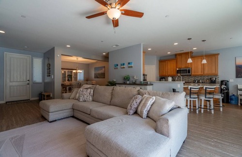 The living room is large with an open floorplan into the kitchen and dining areas, a large couch and a smart TV next to the fireplace with ALL the capabilities to stream whatever you'd like. The gas fireplace is easy to use and enjoy for the cooler evenings or morning coffee. There's also two additional gas firepits in the backyard which put off tremendous heat. The large dining area seats 8 with more seating at the kitchen counter (seats 3) and nook dining area (seats 6) near the kitchen.