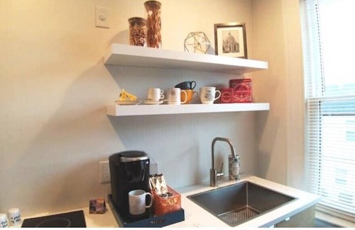 Two years in the making!! Villa Forte was all but abandoned before it was brought back to life with much TLC and an Italian girl's drive. The result - Suite 4, a centrally located second floor apartment with Smart lock entry.. As you enter the driveway, you will have your own parking space in the rear of the property. A code will give you access to the main entrance of the Villa. Enjoy the high ceilings, original hardwood floors, large windows and plenty of natural light throughout. This apartment features a sunny and spacious bedroom with a carefully chosen queen size bed, blackout curtains and a personal closet. The cozy living room offers an ultra comfy sofa for lounging after a busy day and a Smart TV. Games, puzzles and good reads are there ready to be explored. In addition to central air, you will also be able to enjoy remote controlled ceiling fans. The kitchen is fully stocked. It has a stainless steel fridge, stainless sink, basic kitchen necessities (pots, pans, glasses utensils, paper products, etc. ) an electric cooktop, a microwave, smoothie mixer and a toaster. Last but not least-- a Keurig ( we provide pods/creamer) to get you going.