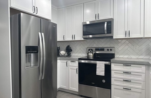 The updated modern herringbone tile kitchen is fully equipped for dining, cooking, baking, or ordering takeout. Eat a meal at the adjacent dining table and make some everlasting memories.