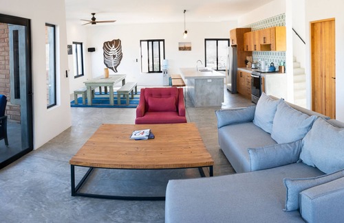 Casa Ocean Brick is designed by renowned La Paz arcitects ABAC Architecture, is a rustic modern classic. It features a huge open concept living area on the top floor, and 3 bedrooms on the 1st floor. Each bedroom has ocean views from each bed, and a private patio off the master