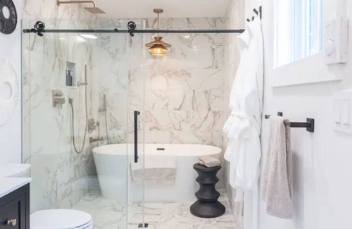 The en-suite bathroom is a haven of indulgence. The freestanding tub takes center stage, offering a spa-like escape for soaking away the day's stresses.