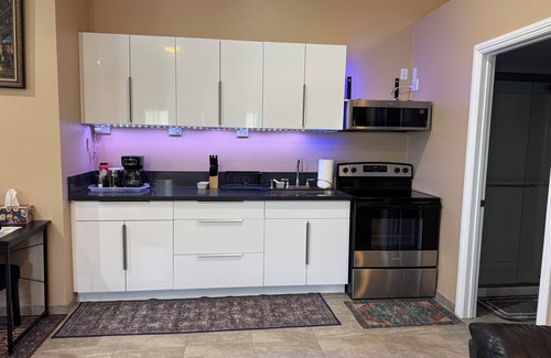 Welcome to our modern Riverside studio. This cozy retreat features a king bed, spacious desk for remote work, big screen TV, a fully equipped kitchenette, roomy bathroom, and an optional room divider for added privacy.