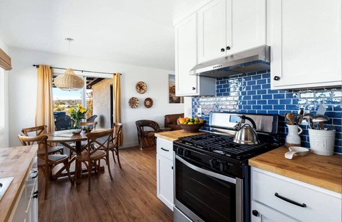 Perched on five acres by Homestead Valley Canyon, #MojaveStargazer blends comfort with nature's grandeur. This freshly renovated 3-bedroom, 2-bath home boasts a spacious interior, while outside, a fire pit, al fresco shower, deck, BBQ, hammock, and a valley-facing swing beckon. Experience star-studded nights free from light pollution, connecting intimately with nature's wonders. The home is thoughtfully designed with minimalist, desert-chic finishes and a relaxed bohemian vibe, offering an ideal escape for those seeking peace and tranquility.