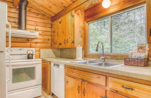 Refresh in the secluded, creekside setting of the Moondance Cabin, a Panabode Log Cabin with classic mountain charm and character. The warm and cozy wood log interior and the fireplace will be the perfect place to kick back and make the most of your Mt Hood vacation. Prepare a tasty dinner in the fully-equipped kitchen or grill on the gas BBQ on the creekside deck.