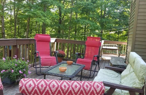 3 bdrs 2.5 bths, sleeps 8, cathedral ceilings, skylights, bright, spaceous, yet cozy home, full kitchen, large diningroom table and kitchen island, wrap-around deck, lovely yard with lawn surrounded by woods, fire pit and gas grill to enjoy. Air Conditioning covers the upper two levels, the walkout basement naturally stays cool in the summer. Seasonal mountain views. We are two houses away from a wonderful swimming hole. Swimming, hiking/biking trails, snowmobiling, kayaking, fishing near the house. Wonderful lakes are close by!