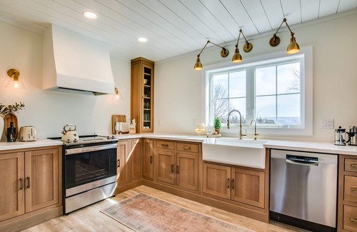 Morning Dove was originally built in the late 1800's but was completely renovated in 2021. We've kept some of the "old world" charm from it's early years....exposed original ceiling joists and other details. Walking in the front door, you'll enter the Living Room area which has an electric fireplace, Frame TV, and glass patio doors that bring in the view of the back yard and the lake in the distance. The doors lead out onto the back deck and the large yard.