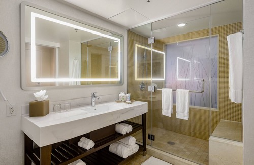 Morongo Casino Resort Spa offers 310 accommodations with MP3 docking stations and safes. Pillowtop beds feature Egyptian cotton sheets and premium bedding. 65-inch Smart televisions come with premium cable channels, first-run movies, and pay movies. Bathrooms include bathrobes, designer toiletries, complimentary toiletries, and hair dryers.