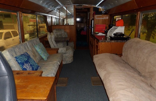 1963 Rockstar tour bus! This motor coach is very comfortable, Two twin beds in the bedroom, cold A/C, and hot water. Small kitchen with hotplate and microwave. TV in the bedroom and living room.