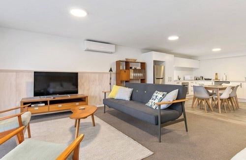 Set high to take in the fabulous views, this home has 2 levels; upon entry on the ground floor, you'll find two bedrooms with a shared bathroom. Also on the ground floor is a cool 63 m2 self-contained retro-style apartment with a bathroom, full sized kitchen, dining for 6 and a spacious lounge with a "tilt-away" queen bed and a NOOD sofa that converts into a double bed. The ground floor terrace seats 4 and has its own BBQ. There is also a storage area for bikes, skis etc.