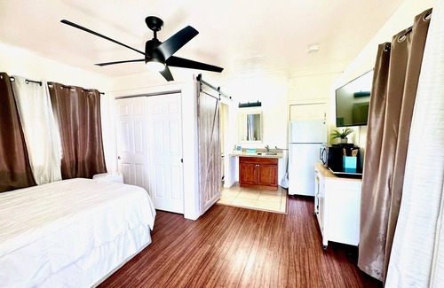 Nestled at the base of the lush tropical Koolauloa mountains range, a hiker’s paradise awaits. Secluded beaches are walking distance away. Polynesian Cultural Center, zip lines, and horse back riding are 5 to 10 minutes away. The studio is 300 sqft and has one Queen size bed, one queen size air mattress, and one full size air mattress. We have snorkeling gear, body boards, beach chairs and mats for your use. We have a hot plate, microwave, full size fridge/freezer, coffee maker and blender. The bathroom features a rustic barn door and a full size tub and shower. WiFi, TV, cable and Netflix are included as well as AC. For questions about availability please inquire. I’ll do my best to accommodate you.