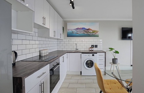 Experience the ocean's aroma and breathtaking panoramic views of Table Mountain and the ocean from our private newly renovated apartment in the heart of Bloubergstrand in Coral Road. A mere 80 meters from the beach. Stay entertained with full DSTV, Netflix, and strong Fibre internet. Enjoy a tranquil workspace while soaking in the serene surroundings. This gem offers a homey feel with a lovely balcony, safe gated parking, and convenient lift access. The perfect blend of comfort and luxury.