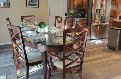 The well-equipped kitchen is appointed with stainless steel appliances, granite countertops, and a kitchen island. Convenient appliances like an InstaPot, toaster, blender, and coffee maker will make any meal prep a breeze. The cook in your group will whip up any meal desired with the available cookware. The dining table seats up to 10 when meals are ready.