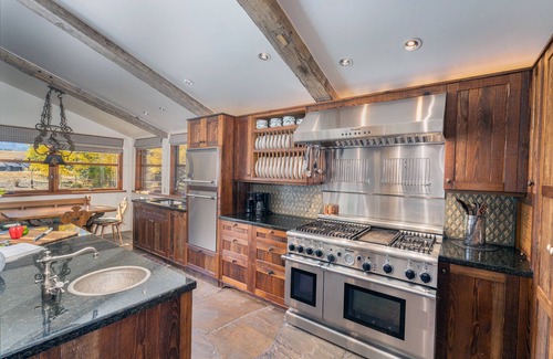 Gather in the DINING ROOM, with seating for 8 and an iconic CLASSIC COLORADO ELK ANTLER CHANDELIER, setting the stage for unforgettable dining experiences.
