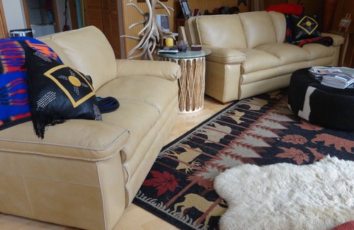 Modern, Cedar frame house; Master bedroom is a loft, with aspen furniture, a sitting area including a sleeper couch and TV. Also: a large bathroom with his and her sinks and walk in shower, downstairs is an open floorplan with bathroom, leather couches, fire place, hickory dinning set, antler chandelier and floor lamps. Modern kitchen with new appliances and washer dryer. New Atrium doors open out to a giant porch overlooking the village and ski area. Two car heated garage.