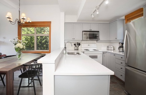 This bright 3-level townhome has skin-in/out access, a fireplace and a private outdoor hot tub looking out into a forest. It’s very peaceful.