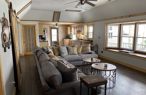 The inside of this alluring space is quite cozy and comfortable, with each room of the spacious 2100 square foot lodge having its own interesting theme. Whether you want to relax and enjoy a cup of hot coffee in front of the gas fireplace, watch a game in the family room or take a hot bubble bath in the inviting master bath, the interior has something for everyone, including your pup!