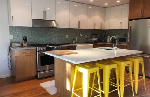 The Kitchen is fully equipped with a farmhouse sink. There is a large island that seats 5 and the bright yellow stools add a colorful , modern touch. There is also a built in breakfast nook which seats 6 . The kitchen features a GE Refrigerator/ Freezer with Ice maker, GE Gas Cafe Series Semi Professional Range, Miele Dishwasher and is fully stocked with dishes, pots, pans and utensils ready to cook any gourmet meal.