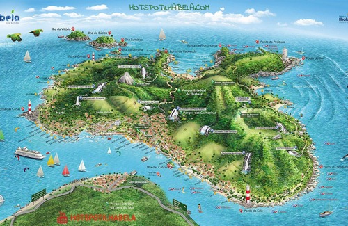 Luxury house with 180º cinematographic view to the sea. Located in a quiet corner and away from the tourist hustle and bustle of Ilhabela, on the other hand the house has the best infrastructure of the island: beach at 250 meters, historic center at 500 meters with bars, restaurants and shops. Positioned on the slope of the hill, with full view of the sea, in the middle of the woods, the house is surrounded by nature. Birds, trees, squirrels (cinglinges), are the neighbors.