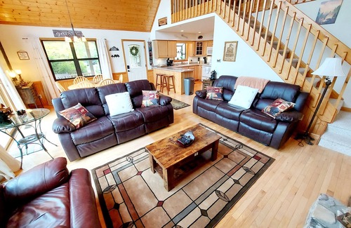 The fully-equipped kitchen, dining room and main living spaces all flow together for a roomy, light and open floor plan. Big 60” LED TV for viewing your favorite shows/movies on the reclining leather sofas. The stone, gas-log fireplace is perfect for gathering around during those cooler months. Sit around the dining room table as a family and admire the mountain views out the windows as you enjoy your meals. Or, dine outside on the deck!